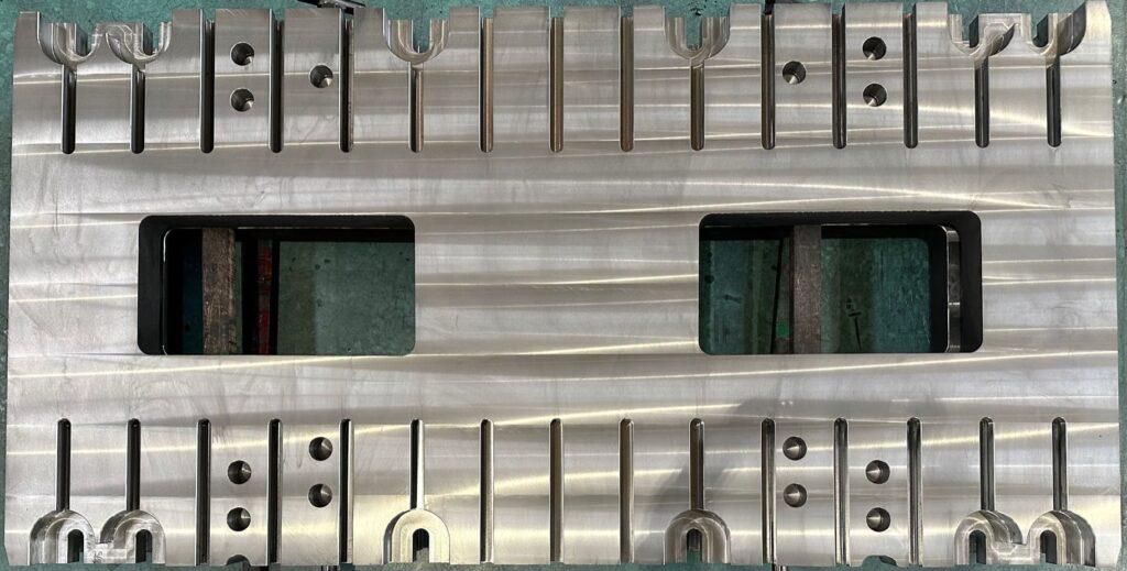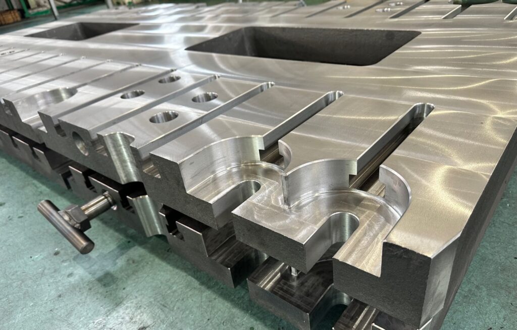 プレス機の定盤ということでフライス加工はもとよりTスロ加工に至るまで加工精度が必要なワークでした。そのため、素材の熱変異を考慮して加工手順を検討し、エアーで意識的に冷却を行いながら加工を行いました。