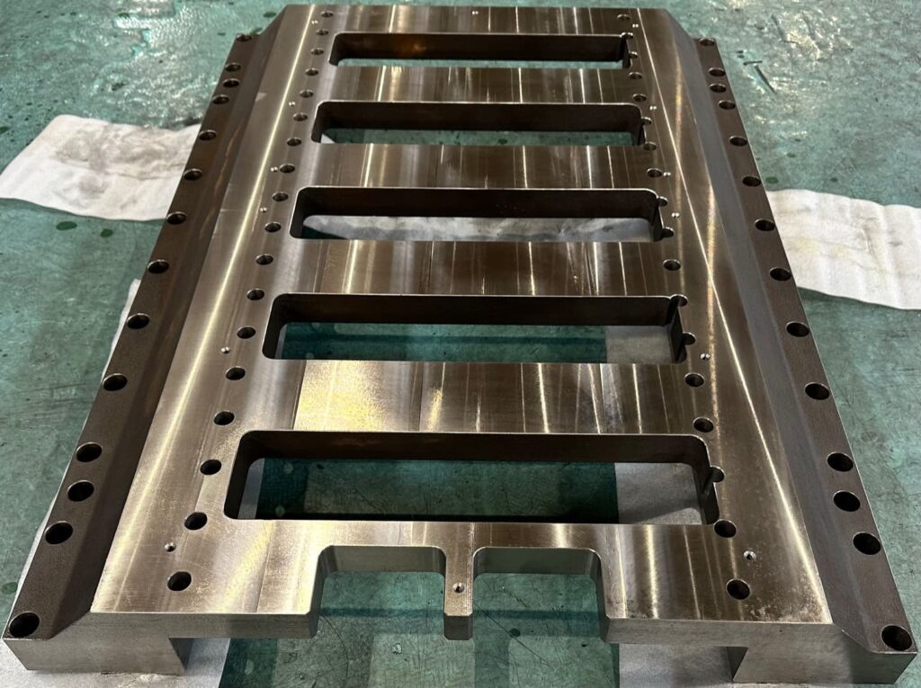 フライス加工で上下面を加工した後、研磨加工で平行度を出しています。また、本製品は工作機械部品なので、特に加工精度が必要な部分は専用の研磨機で加工しました。