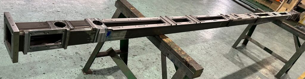 本事例は、産業設備の部品として使用されるSS製の長尺角パイプ(160×160×4,500mm)の加工事例です。角パイプにステイや板材を溶接した後、機械加工を実施しました。