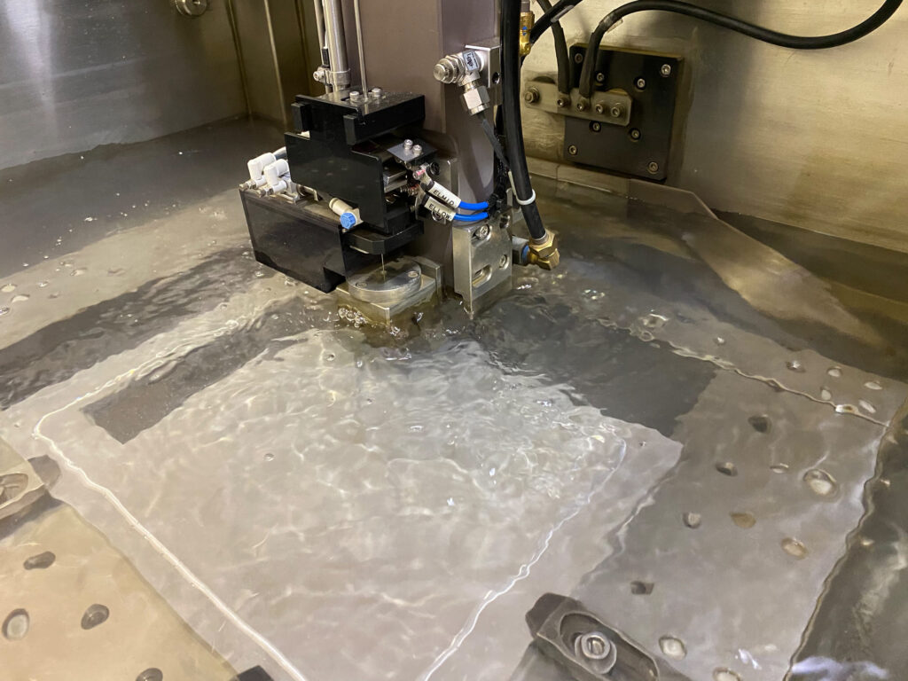 当社の強みは、最大1050mmのワークに対応するワイヤ放電加工機です。これにより、大型マシニング加工後のプレートや金型に対し、ピン角や微細スリットといった高精度な仕上げを一貫して行えます。材質の硬さに左右されないため、焼入れ後の部品への追加工も得意としています。